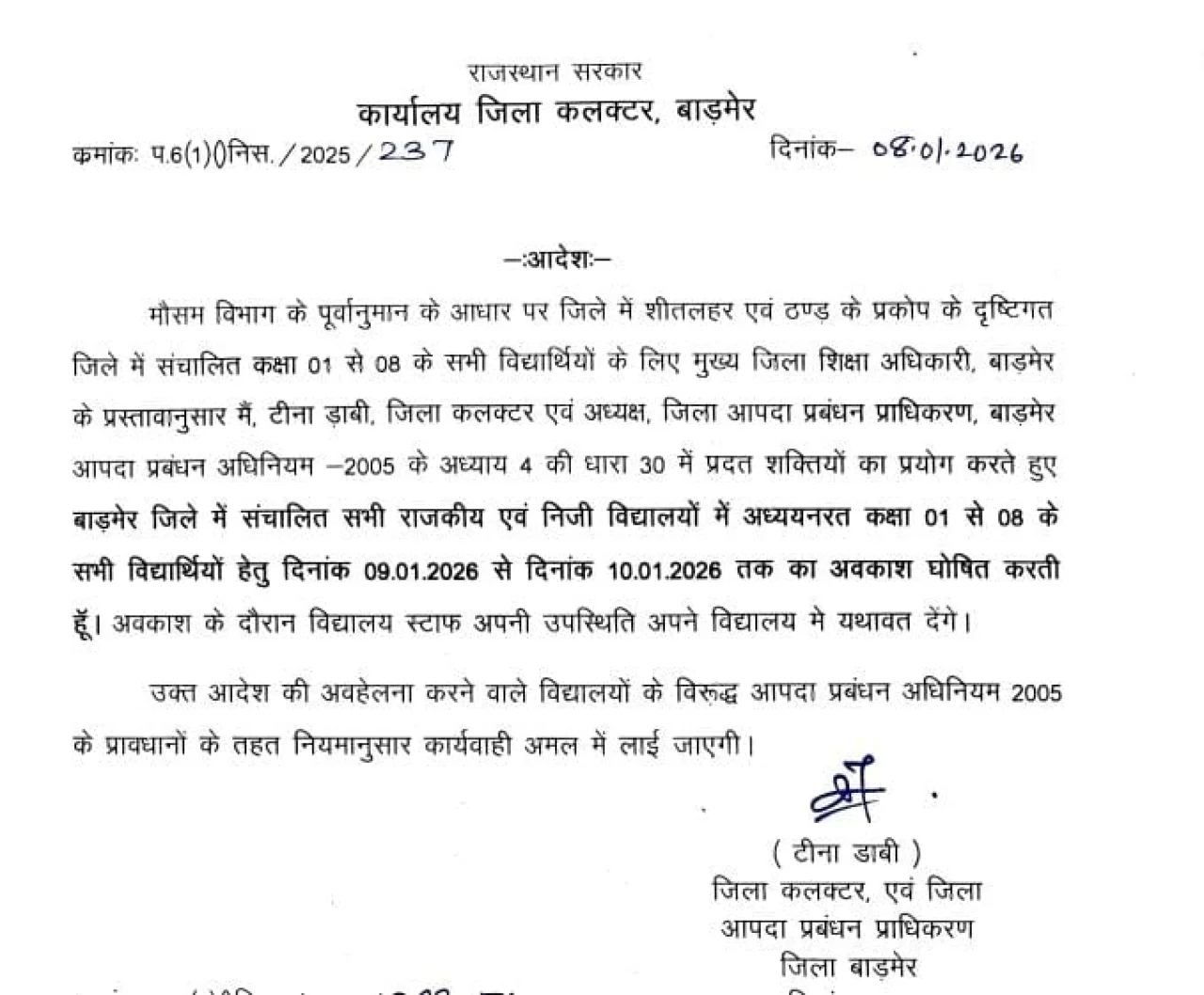 जिला कलक्टर टीना डाबी ने मुख्य जिला शिक्षा अधिकारी,बाड़मेर के प्रस्ताव के अनुसार आपदा प्रबंधन अधिनियम-2005 के अध्याय 4 की धारा 30 में प्रदत शक्तियों का प्रयोग करते हुए बाड़मेर जिले में संचालित सभी राजकीय एवं निजी विद्यालयों में कक्षा 01 से 08 के सभी विद्यार्थियों के लिए 9 एवं 10 जनवरी को अवकाश घोषित किया है।