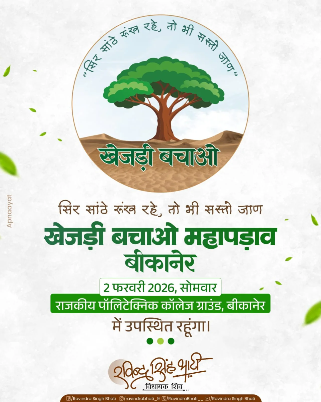 बीकानेर में खेजड़ी बचाओ संघर्ष तेज। रवींद्र सिंह भाटी और सांसद हनुमान बेनीवाल ने कहा– खेजड़ी राजस्थान की धरोहर, कटाई रोकना जरूरी।