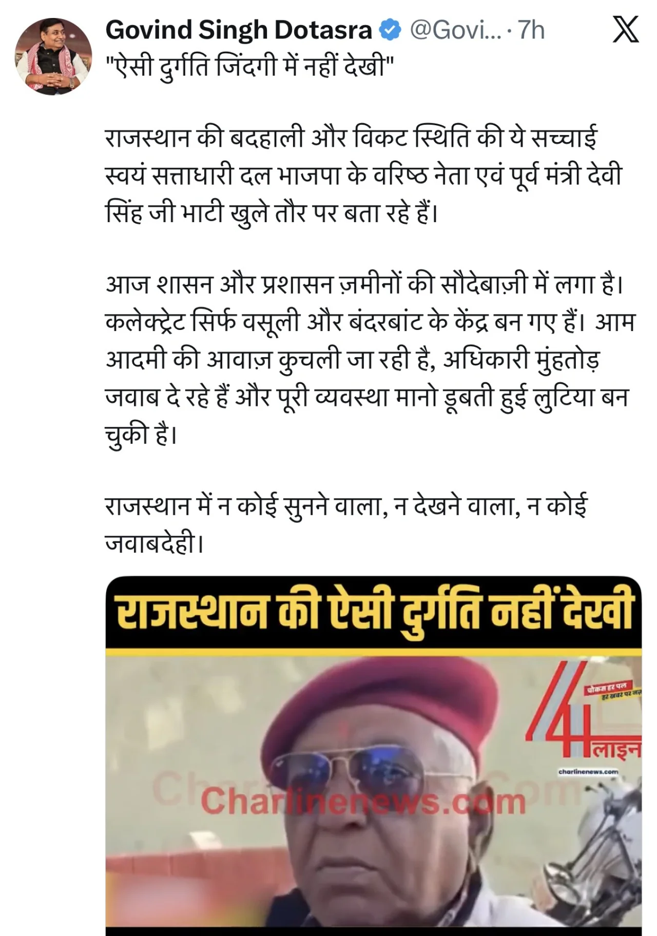 इसी घटनाक्रम का वीडियो कांग्रेस प्रदेश अध्यक्ष गोविंद सिंह डोटासरा ने सोशल मीडिया प्लेटफॉर्म एक्स पर साझा किया। वीडियो के साथ डोटासरा ने लिखा कि भाजपा के ही वरिष्ठ नेता राज्य की बदहाली को खुलकर उजागर कर रहे हैं। उन्होंने आरोप लगाया कि शासन और प्रशासन जमीनों की सौदेबाज़ी में उलझा है और कलेक्ट्रेट कार्यालय वसूली व बंदरबांट के केंद्र बनते जा रहे हैं। डोटासरा ने यह भी कहा कि आम जनता की आवाज़ दबाई जा रही है और पूरी व्यवस्था अव्यवस्थित हो चुकी है।