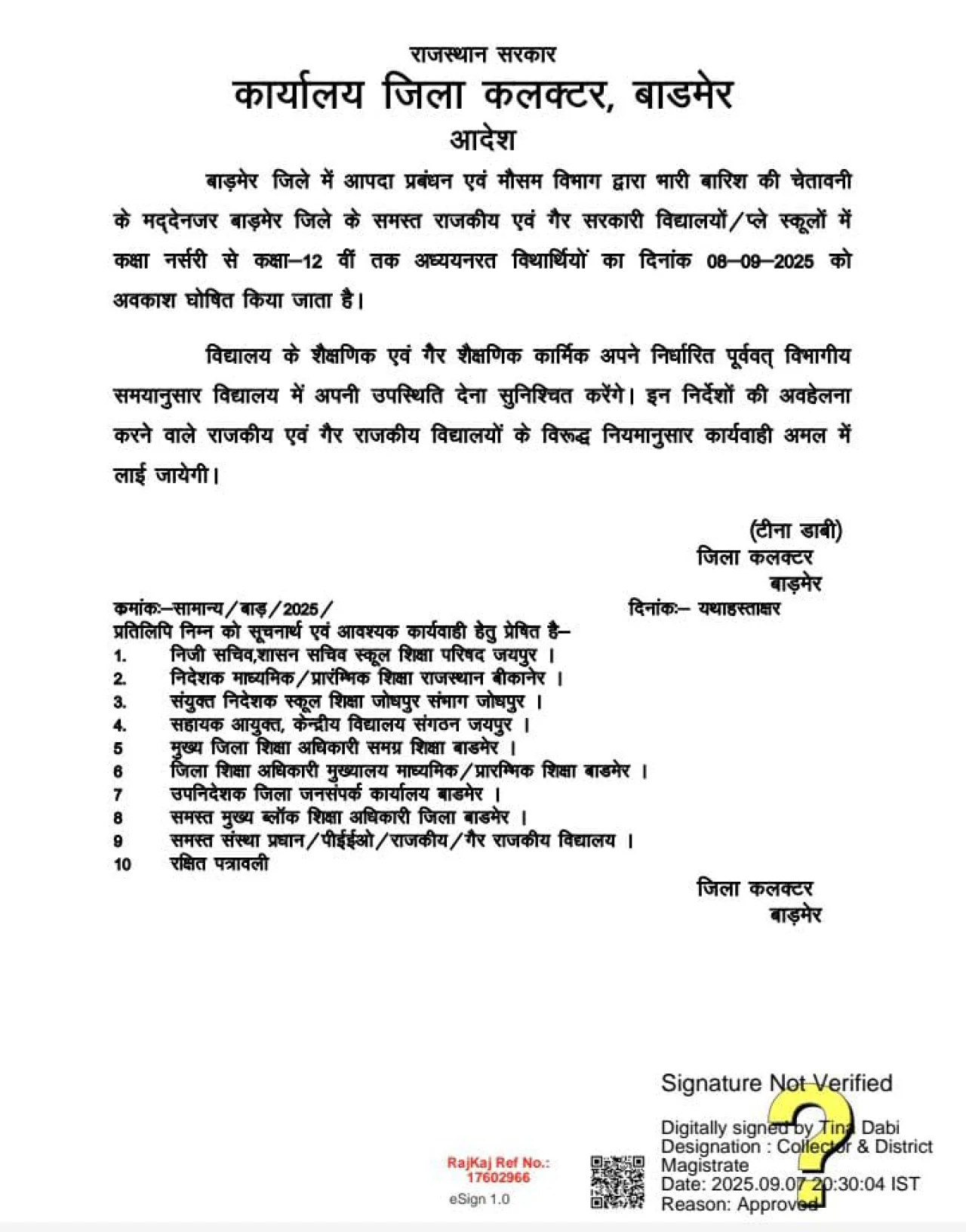 बाड़मेर में भारी बारिश: जिला कलेक्टर ने सावधानी की अपील की, स्कूल-आंगनबाड़ी बंद। नदी-नालों से दूर रहें, आपात नंबर: 02982-222226