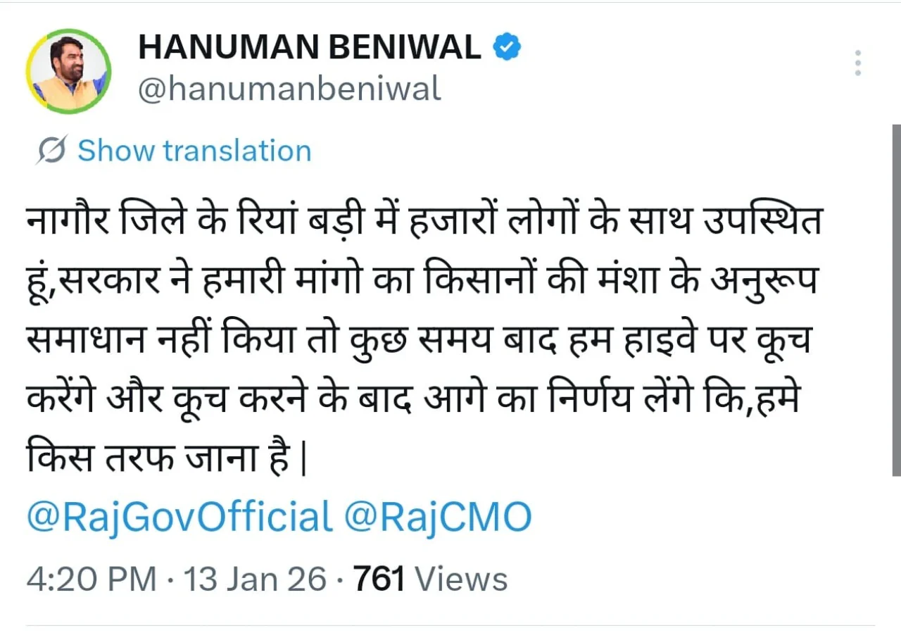 सभा को संबोधित करते हुए बेनीवाल ने कहा कि आंदोलन की पूरी रणनीति तैयार है। जैसे ही इशारा मिलेगा, किसान हाईवे की ओर कूच करेंगे। इस ऐलान के बाद प्रशासन और पुलिस महकमे में हलचल तेज हो गई है। आसपास के हाईवे और प्रमुख मार्गों पर पुलिस ने चौकसी बढ़ा दी है ताकि किसी भी स्थिति से निपटा जा सके। ट्वीट करके हनुमान बेनीवाल ने यह जानकारी दी