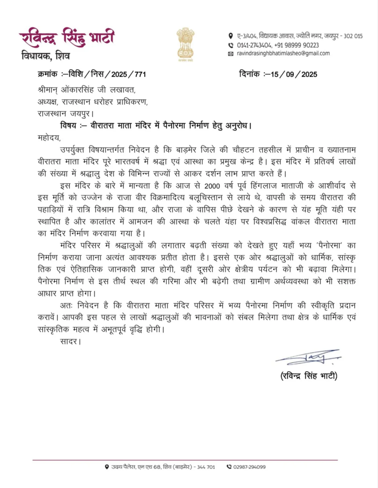 शिव विधायक रविन्द्र सिंह भाटी ने वीरातरा माता मंदिर के विकास के लिए मुख्यमंत्री को तीन पत्र लिखकर पैनोरमा, रोपवे और सड़क चौड़ाईकरण की मांग की।