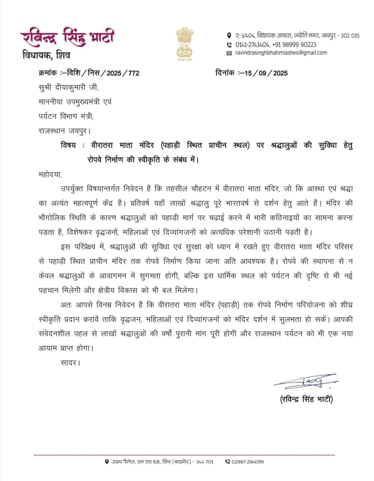 दूसरे पत्र में उपमुख्यमंत्री दीयाकुमारी को लिखते हुए भाटी ने मंदिर के पहाड़ी स्थल तक रोपवे निर्माण की मांग की। उन्होंने कहा कि मंदिर का भौगोलिक स्वरूप वृद्ध, महिलाओं और दिव्यांगों के लिए दर्शन को कठिन बनाता है। रोपवे सुविधा से न केवल श्रद्धालुओं को सहूलियत होगी, बल्कि यह मंदिर पर्यटन के क्षेत्र में नई पहचान बनाएगा, जिससे क्षेत्रीय विकास को गति मिलेगी।