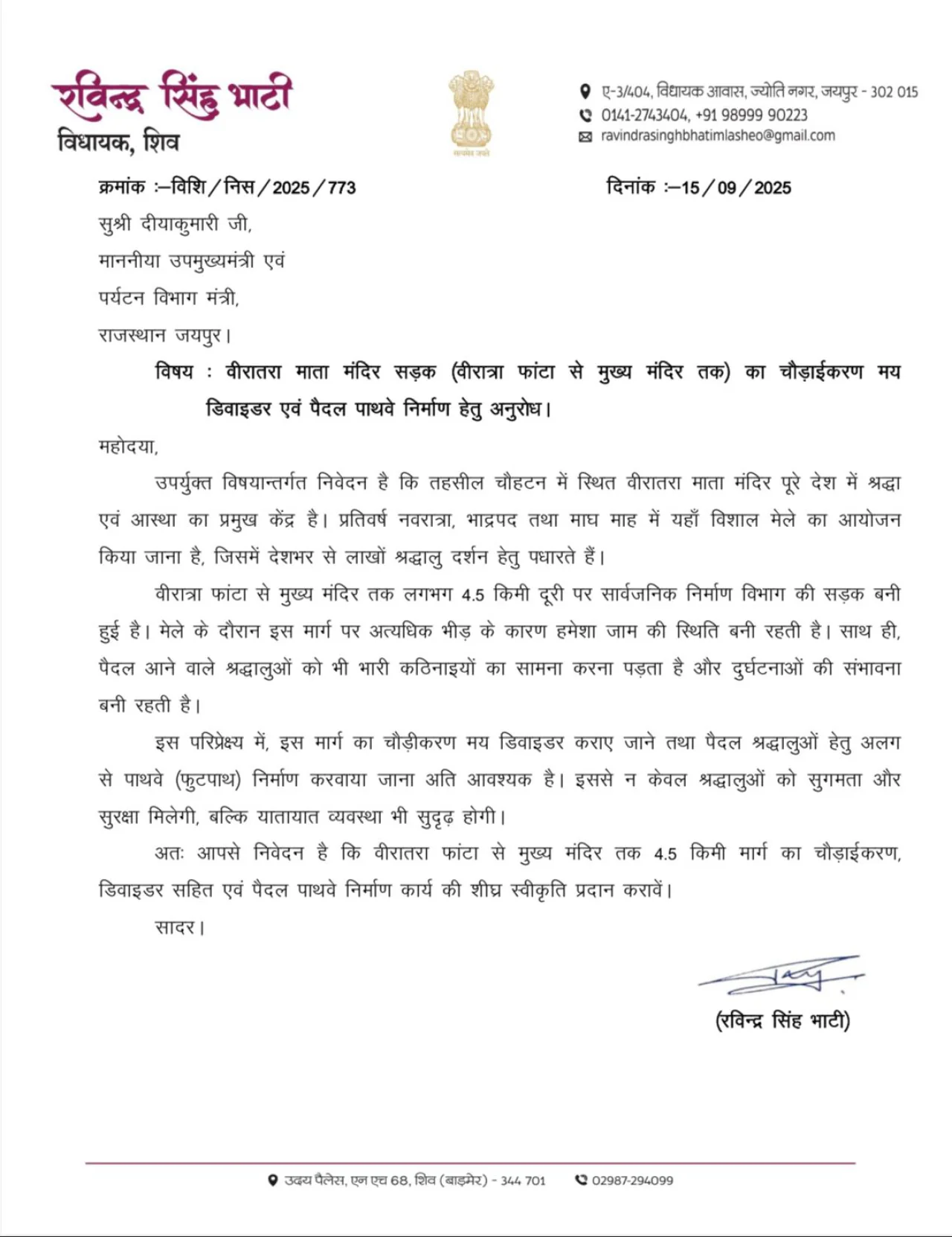 तीसरे पत्र में भाटी ने वीरातरा फांटा से मंदिर तक 4.5 किमी लंबे मार्ग के चौड़ाईकरण, डिवाइडर और पैदल पथ निर्माण का आग्रह किया। उन्होंने बताया कि नवरात्रि और सावन जैसे अवसरों पर आयोजित होने वाले मेले में लाखों श्रद्धालु पहुंचते हैं, जिससे मार्ग पर भीड़ और दुर्घटना का खतरा रहता है। सड़क चौड़ाईकरण और पैदल पथ से यातायात व्यवस्था सुधरेगी और श्रद्धालुओं की सुरक्षा सुनिश्चित होगी।