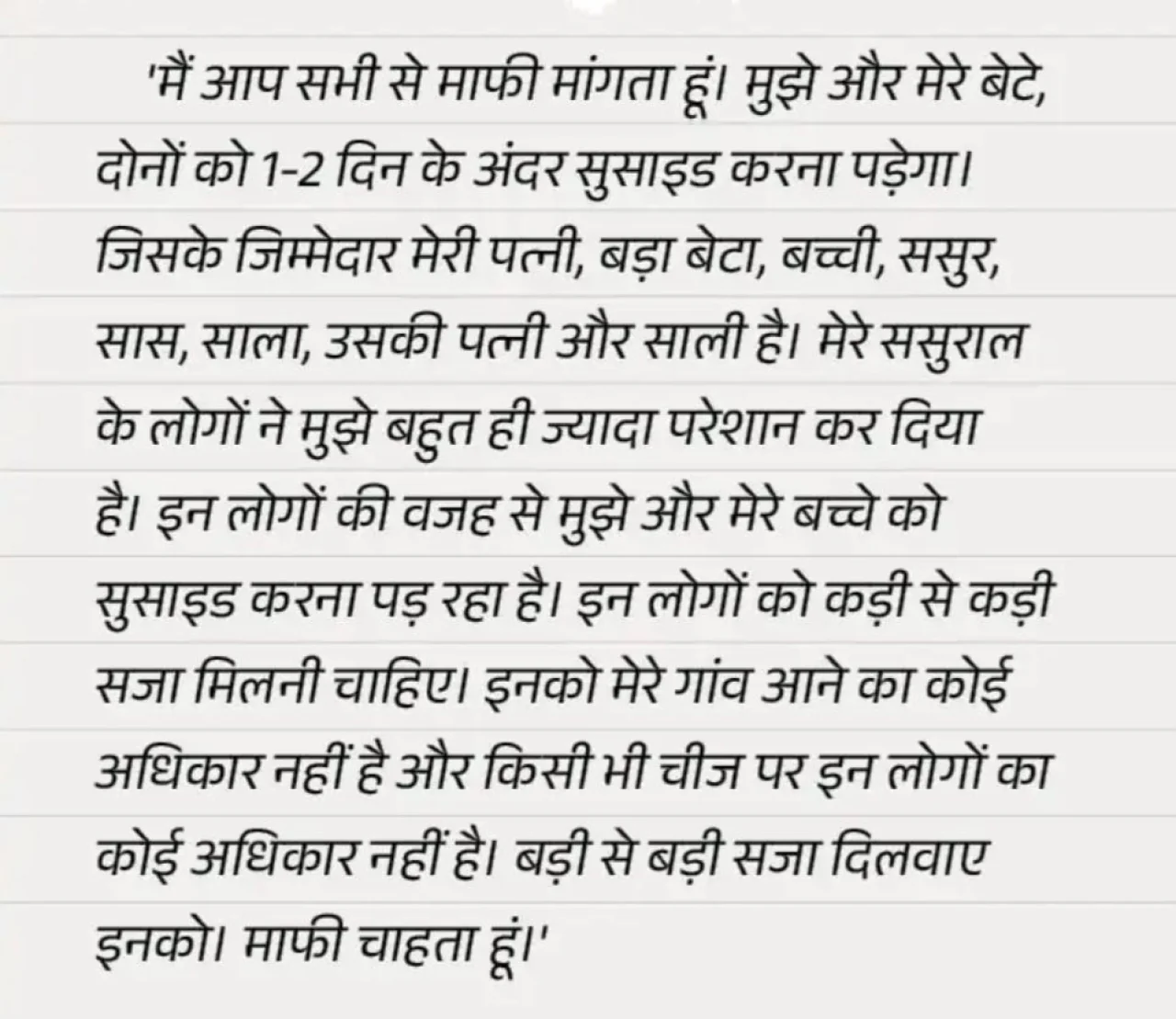 जानकारी के अनुसार युवक ने दो दिन पहले एक वीडियो बनाकर व्हाट्सएप ग्रुप में शेयर किया था। उस वीडियो में युवक ने ससुराल पक्ष पर परेशान करने का आरोप लगाते हुए बेटे के साथ सुसाइड करने की बात कही थी। युवक ने वीडियो में पत्नी, 14 साल के बेटे और 16 साल की बेटी को भी जिम्मेदार ठहराया था।